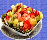 Wash the lettuce, shake the leaves dry and cut them. Cut in different shapes the cheese, ham and vegetables and mix them with nuts. Add vinegar, oil, mustard, dill and salt together and dress the salad.