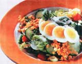 Cut the onion and fry it in butter without letting it brown. Add the lentils and vegetable soup and boil for 20 minutes. Strain the lentils. Peel the eggs and cut them - 4 into circles, 4 into cubes. Cut the cucumber and onion into circles and the peppers into cubes. Mix the yoghurt with 5 tablespoons water, garlic, seasonings and salt. Mix the vegetables with lentils, add the sauce and cover with eggs. Garnish with parsley.